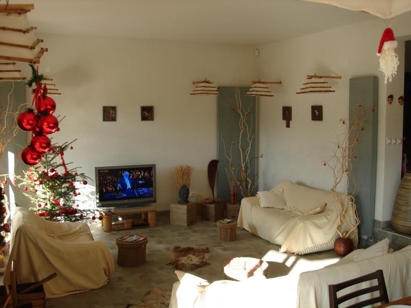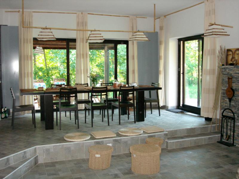 Livingul generos cu şemineu funcţional se deschide către zona de luat masa pentru 10 - 12 persoane şi către bucătăria complet utilată.