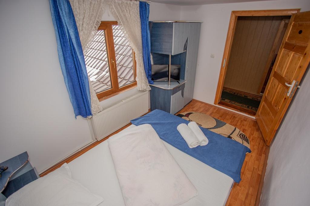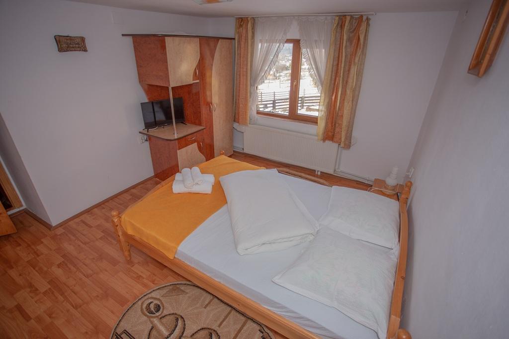 Dispunem de 14 locuri, 3 camere si 2 apartamente, toate dotate cu bai proprii. Avem o bucatarie generoasa, dotata cu tot ce trebuie, living si o sala de mese, spatiu suficient pentru cele 14 persoane care doresc sa se cazeze la noi. In curtea pensiunii se afla un gratar, foisor si loc de joaca pentru copii, iar dealul din spatele casei poate fi in perioada de iarna loc pentru sanius iar in timpul verii un loc in care copiii se pot juca in voia lor.
